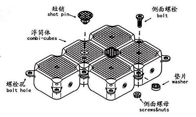 浮筒產(chǎn)品的主要特點(diǎn)在于它的四個定位一耳環(huán),在浮筒的四角各設(shè)一個在筒一平面相互錯開的定位耳環(huán),在耳環(huán)上設(shè)有定位孔,當(dāng)前、后、左、右四個浮筒組合在一起時,四個相對的耳環(huán)正好重疊,用一個特制的插銷插入即可固定,按此法延伸開去,可以組合成任意形狀,任意大小的水上浮動平臺,拆裝簡便快捷,組裝靈活,造型多樣,結(jié)構(gòu)牢固。